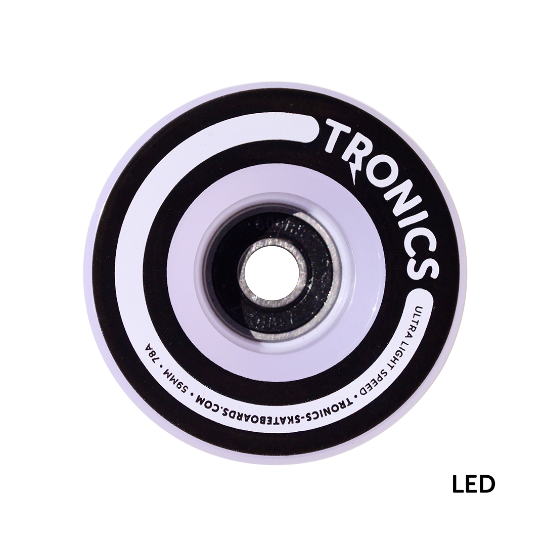 A set of 4 Premium 59×38 mm TRONICS LED wheels made of polyurethane with a durometer  of 78A. The 4 LED wheels will illuminate when you ride your board which creates a striking appearance: day or night. Ignite your ride.
